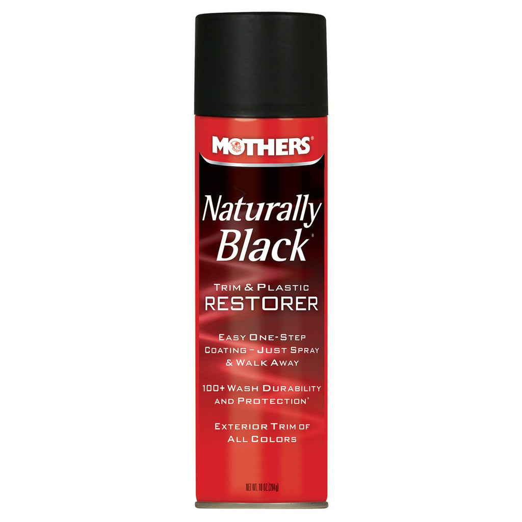 Naturally Black Trim & Plastic Restorer aerosol is Mothers simplest trim care creation yet. Drawing upon industry-proven Back-to-Black surface care technology, this simple mist-on and walk away dressing provides unmatched results and convenient, effortless application. Light oxidation, wax residue and surface film are no match for this surface coating, instantly bringing back that dark, factory-new sheen to any sun-burnt plastic, rubber or vinyl. Once fully cured, youre left with a long-lasting, protective barrier, preventing further deterioration caused by sun, smog, ozone, water, chemicals and airborne contaminants. It makes quick work of tight, difficult-to-reach areas such as grilles, fender wells, engine hoses and other plastic components that are tucked down deep under your hood.