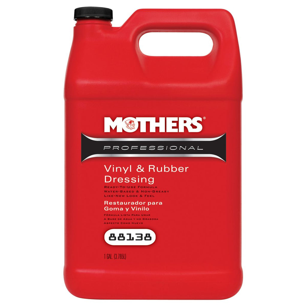 Mothers Vinyl & Rubber Dressing is extremely versatile, and can be used on all vinyl, rubber and plastic surfaces, even engine compartments. Protects all these surfaces from the elements, and leaves a non-greasy, "like new" finish that will not attract dust. This white silicone emulsion features a thick, creamy consistency that is easily sprayed or wiped onto any surface, and dries to a medium-high shine. Does not contain soaps, glycerin or other extenders.